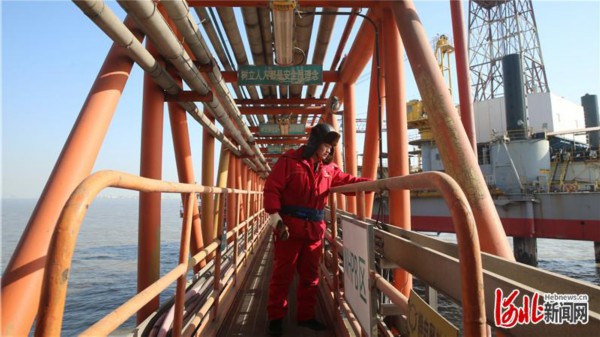 1月29日,在冀东油田南堡作业区1-29导管架上,李松对设备进行日常巡查。通讯员马超摄