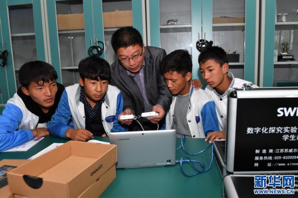 在西藏日喀则市第一高级中学,来自山东省烟台市海阳四中的物理老师鲁旭(中)在指导高三学生进行物理课分组实验(2017年8月23日摄)。新华社记者 张汝锋 摄
