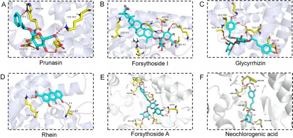 图2.(A)野黑樱苷、(B)连翘苷I、(C)甘草甜素、(D)大黄酸、(E)连翘苷A、(F)新绿原酸的分子对接结果。 论文附图