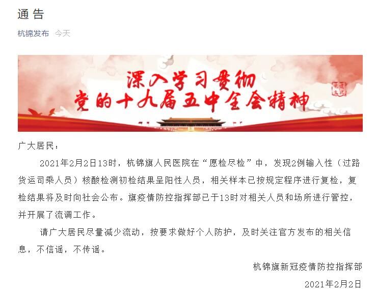 荔枝新闻讯 据“杭锦发布”微信公号消息,内蒙古杭锦旗新冠疫情防控指挥部发布通告。2021年2月2日13时,杭锦旗人民医院在“愿检尽检”中,发现2例输入性(过路货运司乘人员)核酸检测初检结果呈阳性人员,相关样本已按规定程序进行复检,复检结果将及时向社会公布。旗疫情防控指挥部已于13时对相关人员和场所进行管控,并开展了流调工作。