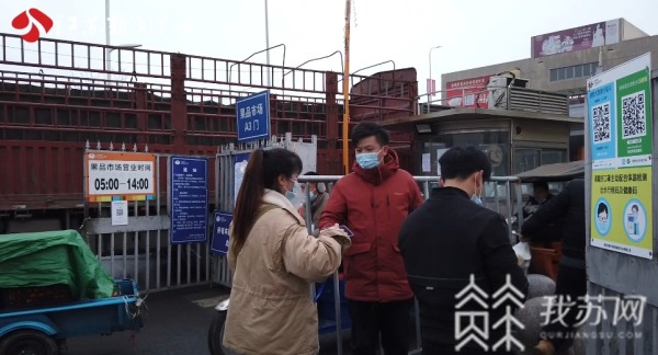 清晨六点,天还未透亮,南京农副产品交易中心果品市场A3号门前,三位身穿统一制服的工作人员已经守在这里,对进入市场内的商户、顾客逐一检查行程码、健康码。这个被市民亲切称为“众彩物流”、年交易量超过千万吨的大型农副产品物流基地,早已做好了疫情防控准备。