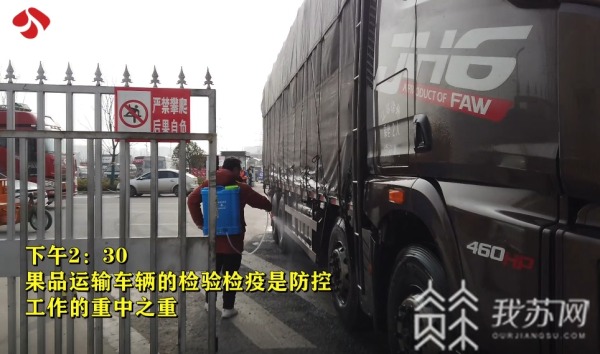 除了对进场人员、商户的疫情防控措施,果品运输车辆的检验检疫是防控工作的重中之重。下午两点半,工作人员张师傅正在仔细对一辆徐州开来的果品车辆整体喷涂药水。