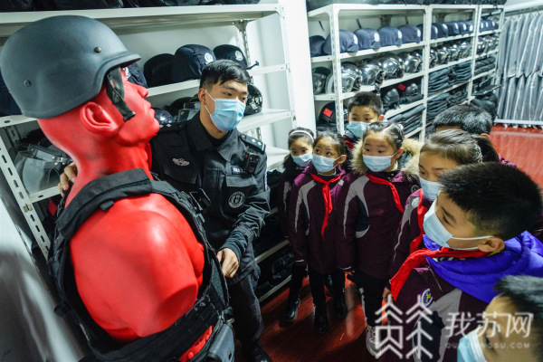 “同学们,欢迎大家寒假到南京铁路公安处特警支队参观,我们的特警就是在这里工作和生活,现在请跟随我的脚步,一起来参观体验吧!”英姿飒爽的女特警李馨悦站在特警支队的荣誉墙面前,向前来参观的小学生们介绍着特警支队的光荣队史。