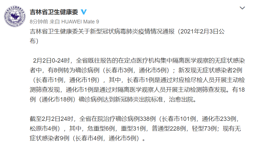 荔枝新闻讯 据吉林省卫健委官博消息,2月2日0-24时,全省既往报告的在定点医疗机构集中隔离医学观察的无症状感染者中,有8例转为确诊病例(长春市3例,通化市5例);新发现无症状感染者2例(长春市1例,通化市1例),其中,长春市1例是通过对应检尽检人员开展主动检测筛查发现,通化市1例是通过对隔离医学观察人员开展主动检测筛查发现。有18例(通化市18例)确诊病例达到新冠肺炎出院标准,治愈出院。