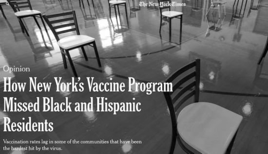 《纽约时报》援引纽约市前卫生官员玛丽·巴塞特的观点称,“现在有能力接种疫苗的人是享有特权的人,这些人并不是面临最高患病和死亡风险的人。这个问题必须解决。”