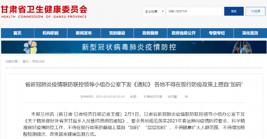2月1日,甘肃省新冠肺炎疫情联防联控领导小组办公室下发《关于精准做好外省来甘返乡人员管控措施的通知》。