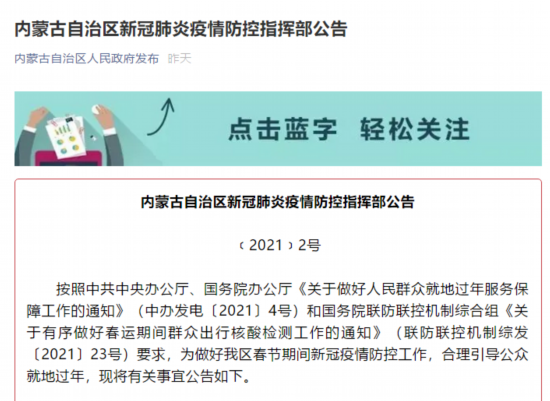 2月2日,内蒙古自治区新冠肺炎疫情防控指挥部发布公告。