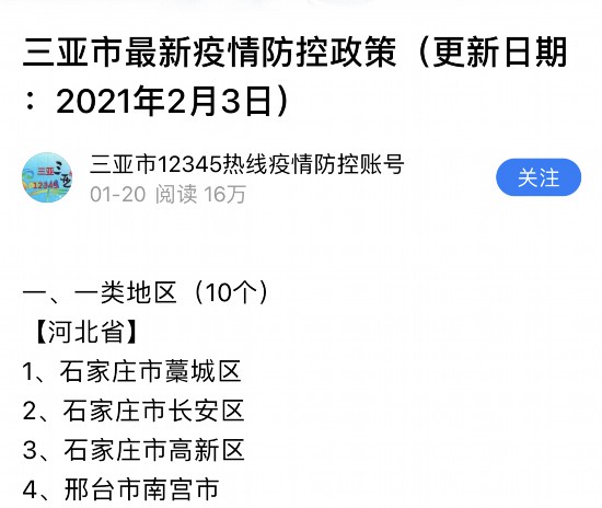 根据海南省三亚市12345公众号今日(2月3日)更新的“三亚市最新疫情防控政策”,规定来自国内低风险地区的非重点人群可凭海南健康码通行三亚,无需核酸检测证明及采样留观等。