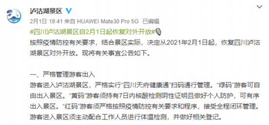 2月1日,四川泸沽湖景区发布恢复对外开放的公告。