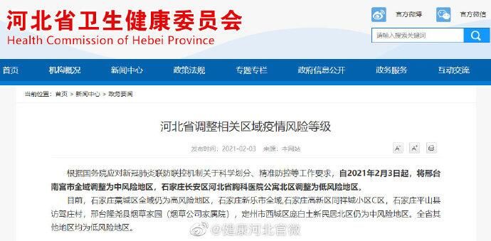荔枝新闻讯 根据国务院应对新冠肺炎联防联控机制关于科学划分、精准防控等工作要求,自2021年2月3日起,将邢台南宫市全域调整为中风险地区,石家庄长安区河北省胸科医院公寓北区调整为低风险地区。