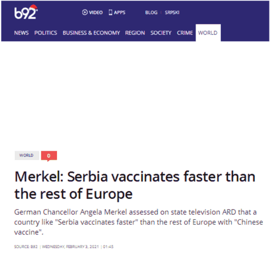 默克尔也承认了。据塞尔维亚新闻网站“B92”3日报道,德国总理默克尔2日接受德国ARD电视台采访时承认,有了“中国疫苗”,像塞尔维亚这样的国家比欧洲其他国家“接种疫苗的速度更快” 。