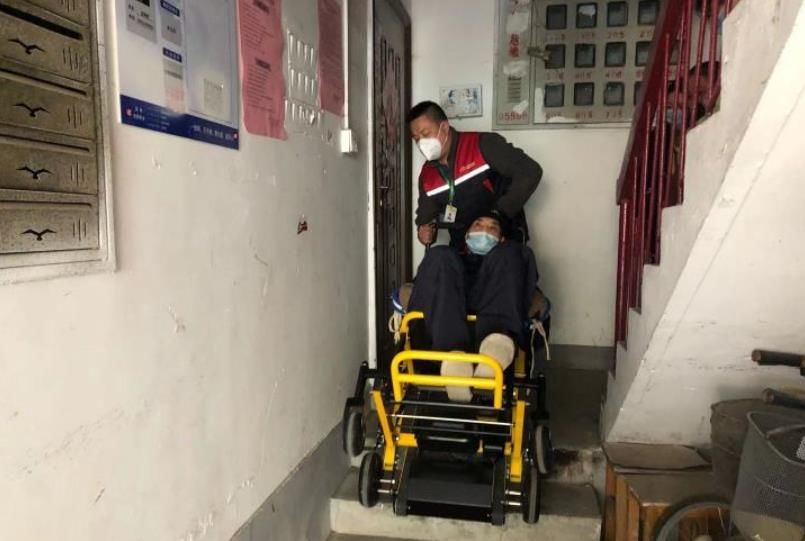坐上车、系好安全带,两名工作人员一前一后操作“爬楼机”,慢慢将王跃武从位于3楼的家中“推”到楼下,“这款‘爬楼机’可以简单理解为有电动助力和履带的轮椅,履带跨度三级台阶,使失能患者的体重得到最佳分配,操作人员也更省力。”当天负责提供服务的江苏太美健康养老服务有限公司市场总监林少成说,理论上一个人也可以操作,但前面配一个工作人员可以帮忙看着一点,更安全。