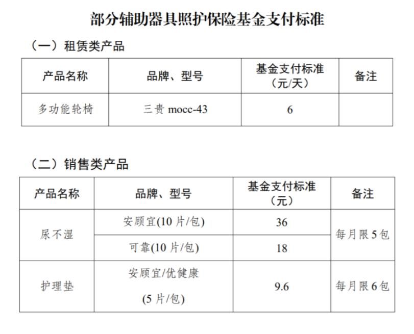 有照护保险辅助器具配置需求,且经过适配评估确认需要配置辅助器具的居家重度、中度失能失智人员可以申请享受辅助器具服务。辅具服务费用实行费用年度限额控制,目前的标准是重度失能、失智人员8000元,中度失能、失智人员6000元。辅具包括尿不湿、护理垫、拐杖等销售类产品,也包括轮椅、护理床等租赁类产品。在限额之内,基金和个人按8:2的比例支付,应由个人负担的费用及超出年度限额的费用由个人现金支付。