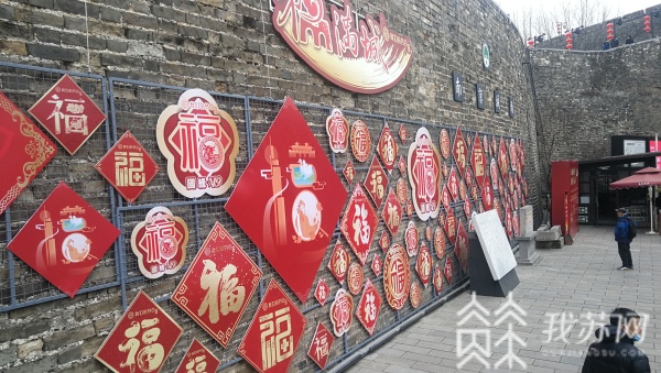 在解放门充满节日喜庆气氛的“百福墙”上,贴着满满的百个福字,既有传统的正方形,也有南京特色的梅花形,大小错落有致,造型丰富多样,和有着655年沧桑历史的城墙相得益彰。