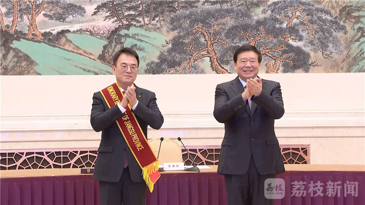 娄勤俭向崔泰源颁授“江苏省荣誉居民”荣誉证书(代领)