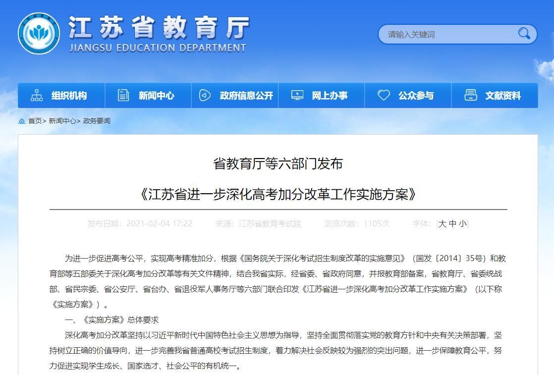 为进一步促进高考公平,实现高考精准加分,根据《国务院关于深化考试招生制度改革的实施意见》(国发〔2014〕35号)和教育部等五部委关于深化高考加分改革等有关文件精神,结合江苏省实际,经江苏省委、省政府同意,并报教育部备案,今天(2月4日),江苏省教育厅、省委统战部、省民宗委、省公安厅、省台办、省退役军人事务厅等六部门联合印发《江苏省进一步深化高考加分改革工作实施方案》(以下称《实施方案》)。