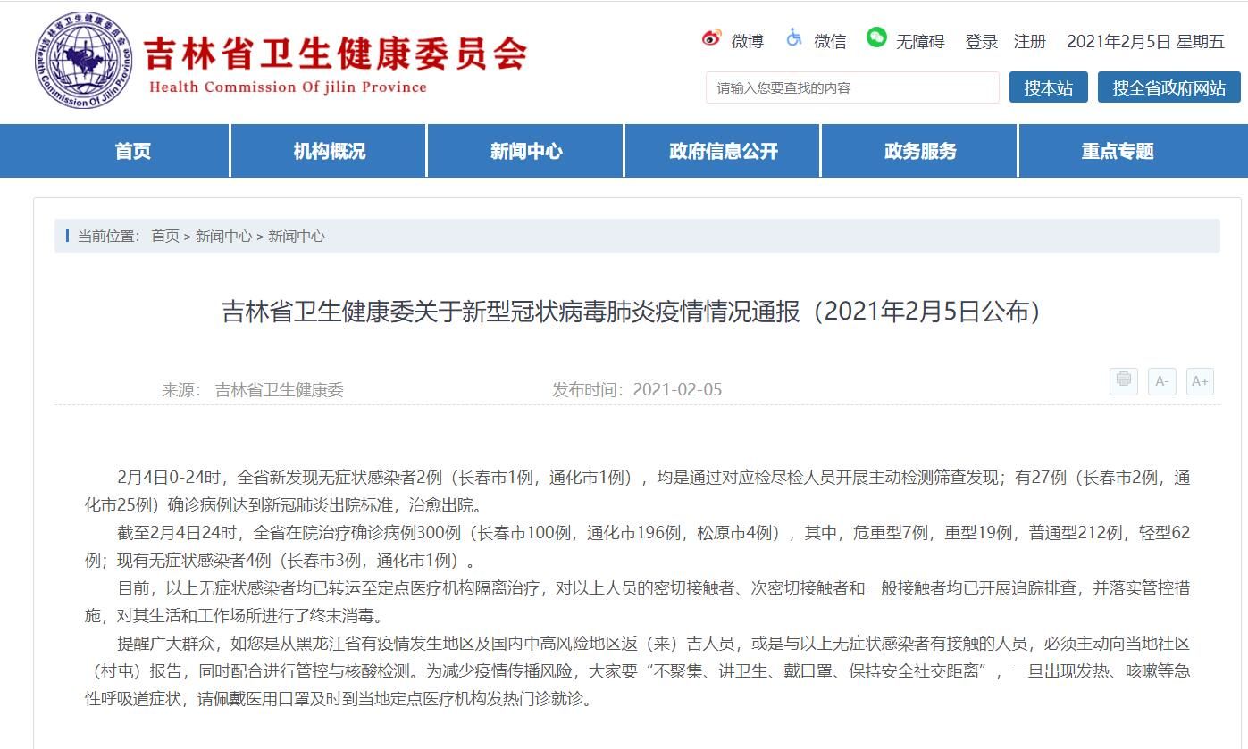 截至2月4日24时,全省在院治疗确诊病例300例(长春市100例,通化市196例,松原市4例),其中,危重型7例,重型19例,普通型212例,轻型62例;现有无症状感染者4例(长春市3例,通化市1例)。
