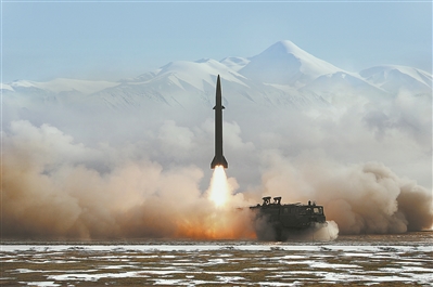 “点火!”一声惊雷,“大地”跟着颤动,新型导弹拖着长长的尾焰腾空而起,直刺苍穹。