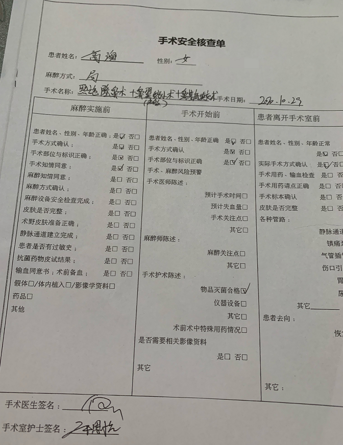 涉事医院手术安全核查单填写项目与实际不符