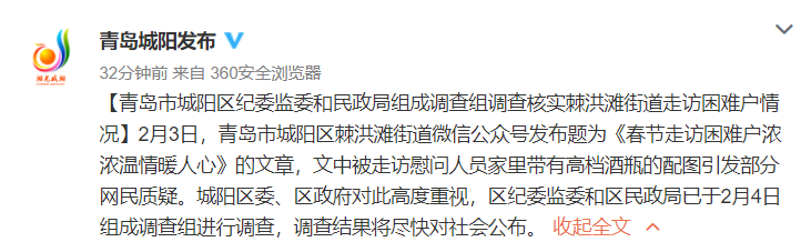 荔枝新闻讯 2月3日,青岛市城阳区棘洪滩街道微信公众号发布题为《春节走访困难户浓浓温情暖人心》的文章,文中被走访慰问人员家里带有高档酒瓶的配图引发部分网民质疑。城阳区委、区政府对此高度重视,区纪委监委和区民政局已于2月4日组成调查组进行调查,调查结果将尽快对社会公布。