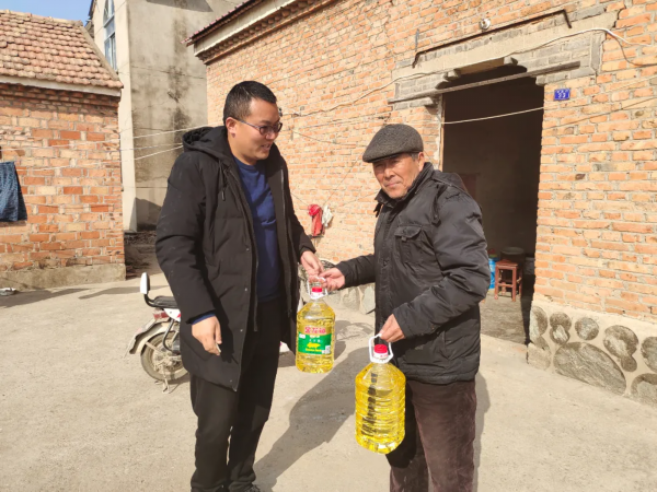 随着春节的即将来临,许多外地求学、打工的人开始陆续返乡,往日宁静的东胡集镇胡南村也开始变热闹了,特别是“逢集”,路上的车辆、行人明显多了起来。虞宏伟开着车小心翼翼地避让着往来行人,他车上装着三十多桶食用油,是准备送给村里部分群众的春节慰问品。