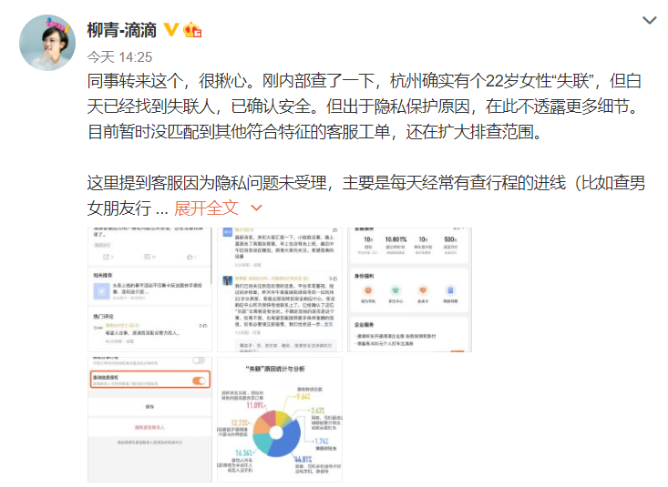 同事转来这个,很揪心。刚内部查了一下,杭州确实有个22岁女性“失联”,但白天已经找到失联人,已确认安全。但出于隐私保护原因,在此不透露更多细节。目前暂时没匹配到其他符合特征的客服工单,还在扩大排查范围。