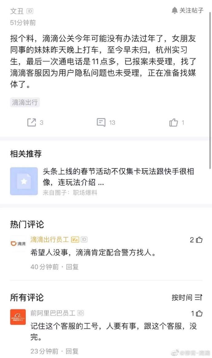 此前有网友爆料称,杭州一22岁女生乘坐滴滴网约车失联。