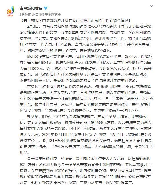 关于网友质疑问题,经调查,网上图片系两位老人大女儿家,房屋建筑面积93平方米;茅台和五粮液是于某某从亲戚家宴会上带回的空瓶;冻顶乌龙茶叶手提袋,系其亲戚到家中探望时携带,现内装闲置杂物;电视为海信牌47寸普通电视;疑似的跑步机是儿童手推车;疑似海参实际是发黑的山楂干;疑似葛根粉实际是三七粉;钟表为康巴丝石英表;兰花为从集市上购买的普通墨兰。