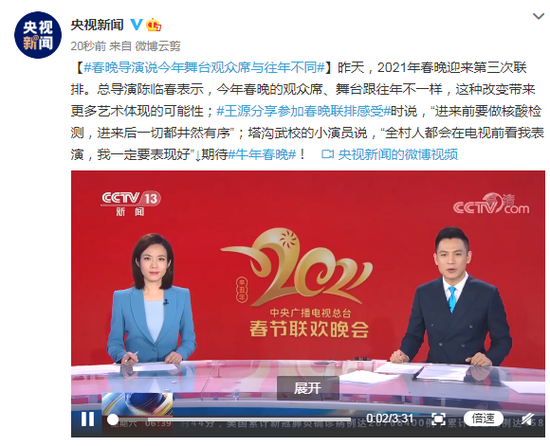 昨天,2021年春晚迎来第三次联排。总导演陈临春表示,今年春晚的观众席、舞台跟往年不一样,这种改变带来更多艺术体现的可能性;王源分享参加春晚联排感受时说,“进来前要做核酸检测,进来后一切都井然有序”;塔沟武校的小演员说,“全村人都会在电视前看我表演,我一定要表现好”。