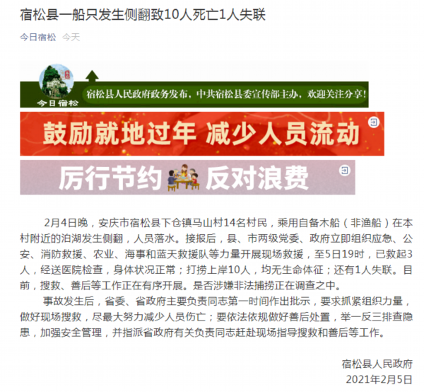 荔枝新闻讯 据宿松县委宣传部官方微信号“今日宿松”2月6日凌晨发布关于“宿松县一船只发生侧翻致10人死亡1人失联” 的最新通报。