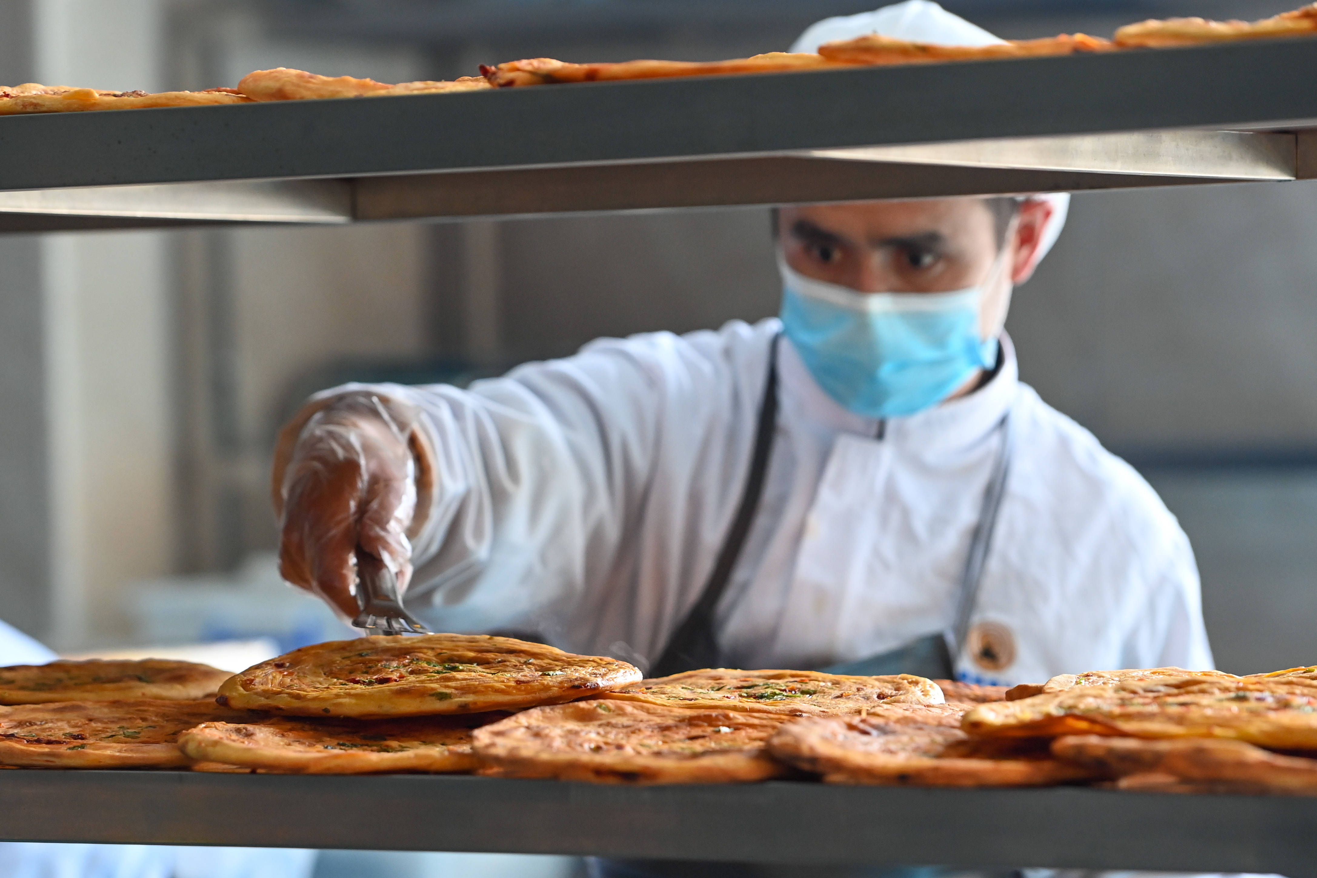春节临近,位于中国和哈萨克斯坦边境口岸的新疆霍尔果斯馕产业园内,工人正加紧生产,赶制各种特色馕产品,丰富百姓餐桌。
