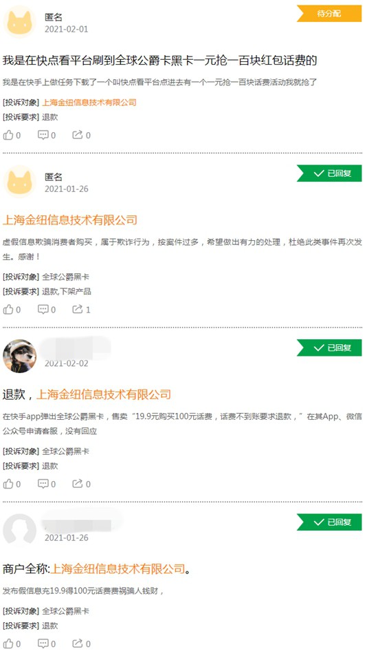 退款不是你想退就能退。在黑猫投诉上,1月份、2月份,大量网友在投诉上海金纽信息技术有限公司以及“全球公爵黑卡”,几乎都是被骗19.9元的事情。