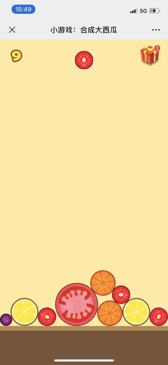 《合成大西瓜》游戏页面右上角出现“礼物”图标。截图