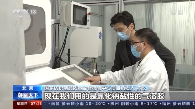 国家纺织制品质量监督检验中心项目负责人 黄聪:现在我们用的是氯化钠盐性的一个气溶胶,然后来测试,然后这个测试的气溶胶粒径,是0.075微米的一个粒径,它是模拟日常的空气当中的这个颗粒物的一个粒径的大小来测试的。