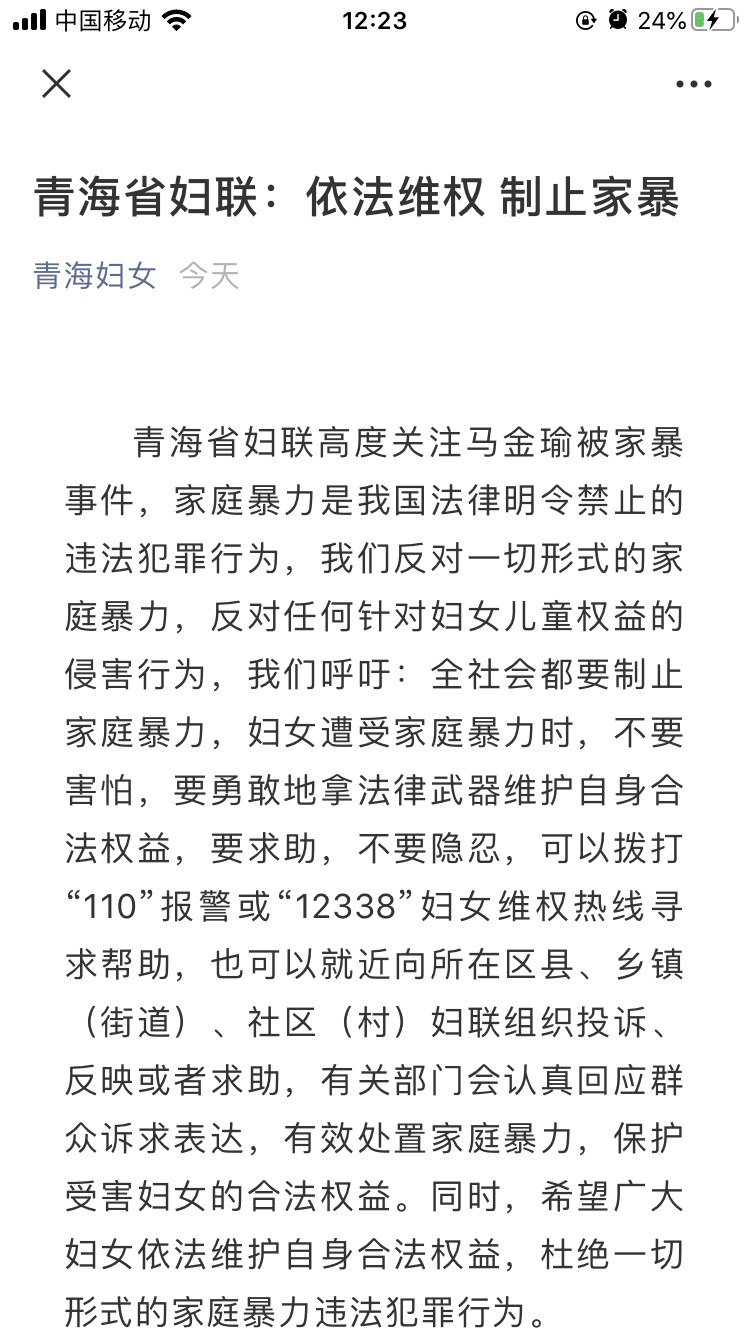 荔枝新闻讯 据青海省妇联官方微信号“青海妇女”消息,青海省妇联高度关注马金瑜被家暴事件,家庭暴力是我国法律明令禁止的违法犯罪行为,我们反对一切形式的家庭暴力,反对任何针对妇女儿童权益的侵害行为,我们呼吁:全社会都要制止家庭暴力,妇女遭受家庭暴力时,不要害怕,要勇敢地拿法律武器维护自身合法权益,要求助,不要隐忍,可以拨打“110”报警或“12338”妇女维权热线寻求帮助,也可以就近向所在区县、乡镇(街道)、社区(村)妇联组织投诉、反映或者求助,有关部门会认真回应群众诉求表达,有效处置家庭暴力,保护受害妇女的合法权益。同时,希望广大妇女依法维护自身合法权益,杜绝一切形式的家庭暴力违法犯罪行为。