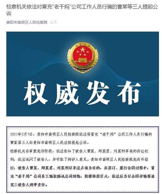 荔枝新闻讯 据贵阳市南明区人民检察微信公众号消息,2021年2月7日,贵阳市南明区人民检察院依法将冒充“老干妈”公司工作人员行骗的曹某等三人向贵阳市南明区人民法院提起公诉。