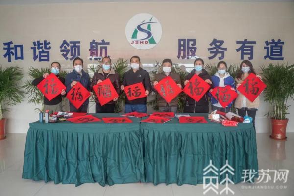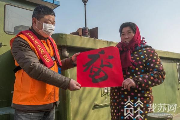 送“福”上船头,带着对船民的新春祝福,泰州港航志愿者把手写的春联、福字送到船头,为船民送上口罩等防疫物资和一些小礼品,并叮嘱他们做好防护措施,“船舶开航前后要注意收听天气预报,随时关注航行通告,雾天航行时,要加强瞭望……”。