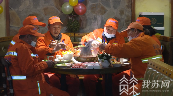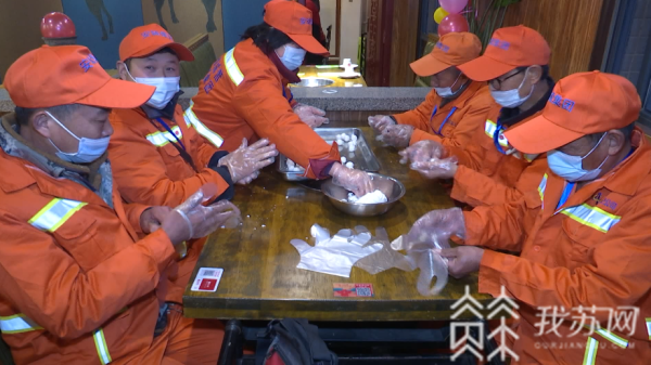 为了响应政府号召,今年春节,南京有很多环卫工人选择就地过年,坚守岗位,为城市的保洁贡献力量。得知这一情况后,南京一家爱心餐饮企业主动邀请他们进店包汤圆,吃火锅,让环卫工人提前吃上了别样的团圆饭。