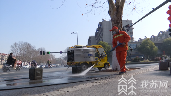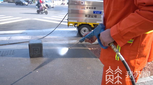 张辉告诉记者,为了让大家过一个干净整洁的春节,最近他一早就要起床,除了负责清扫路面上的垃圾和落叶,还要用水枪把地面冲洗的干干净净。