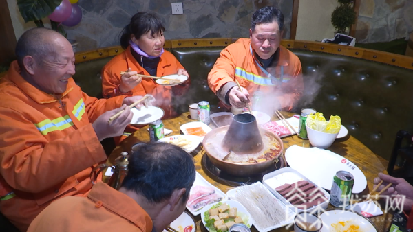 圆圆的汤圆象征着团圆,热气腾腾的火锅飘出了别样的年味儿,环卫工人三五一桌,提前吃了一顿暖心的团圆饭,就地过年感受到了家一样的温暖。