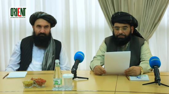 △塔利班代表团在会谈后通报谈判情况(来源:东方通讯社视频截图)