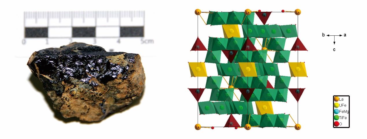 海塔铀矿是我国核地矿系统成立近70年来发现的第7个新铀矿物,也是第3个原生新铀矿物。海塔铀矿被发现于四川省攀枝花市米易县海塔地区,呈巨粒集合体形态,产出于中元古代云母片岩与新元古代混合花岗岩接触带内,黑色,金属光泽,具强放射性。该铀矿化学成分复杂,在自然状态下呈变生状态,研究难度极大。研究团队通过精细的物理性质鉴定、化学成分测定、晶体结构测试等系统矿物学研究后,针对该矿物族中元素的占位提出了全新见解,确定其为一种自然界尚未被发现的尖钛铁矿族新矿物。