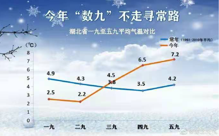 长江中下游一带,今年“数九”不走寻常路,“一九”“二九”平均气温较常年偏低,而“三九”至“五九”平均气温较常年明显偏高。今冬气温是个啥“套路”?