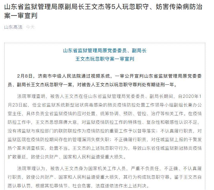 荔枝新闻讯 据山东省高级人民法院微信公众号“山东高法”8日发布消息,山东省监狱管理局原副局长王文杰等5人玩忽职守、妨害传染病防治案一审宣判,全文如下: