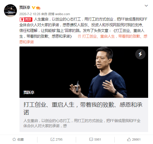 “与FF全体合伙人一起把FF做成、和回国推动中美双主场战略,依然是我人生下一阶段的核心使命。”在贾跃亭现在的置顶微博文章中,他是这样说的。