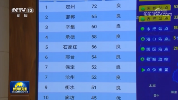在这块大屏幕上,河北省各县市的大数据排名、空气质量谁好谁坏一目了然,考核结果每月一通报,奖优罚劣。