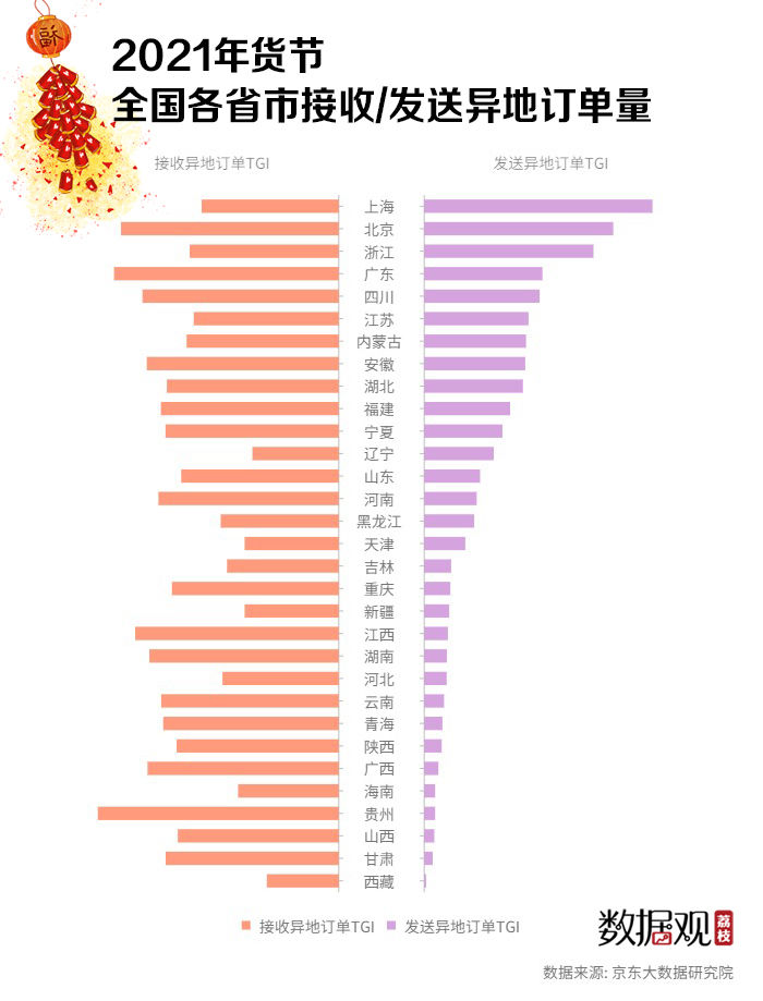 京东年货节消费趋势报告显示,从发送订单量TGI(相关订单占所有订单的比例)来看,上海、北京、浙江、广东和四川等吸纳外来人才较多的省市名列TOP5,对应的接收目的地,前5依次为贵州、江西、四川、安徽和广西,是许多都市打工人的家乡。