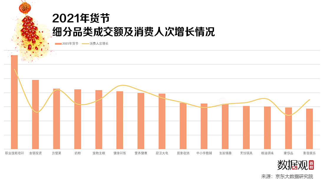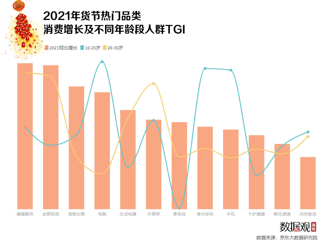 对比去年电商年货节的消费结构可见,人们除了对医护健康类支出持续增长外,在宠物生活、个人护理、教育培训和图书等品类的消费占比均增长较大。