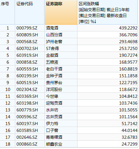 酒鬼酒股价涨幅超439%,山西汾酒超366%,泸州老窖超293%,ST舍得超253%。