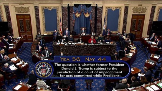 当地时间2月9日,美国国会参议院经过投票以56票同意,44票反对的结果确认了对美国前总统特朗普弹劾案的审理符合宪法。